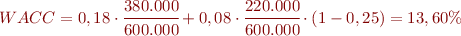 Una empresa que té un finançament propi de 380.000 € amb un cost de capital dels fons propis del 18%, finançament aliè de 220.000 € amb un cost de capital dels fons aliens del 8% i si el tipus de gravamen de l’impost de societats és del 25%, el seu cost mitjà ponderat del capital (WACC) és: