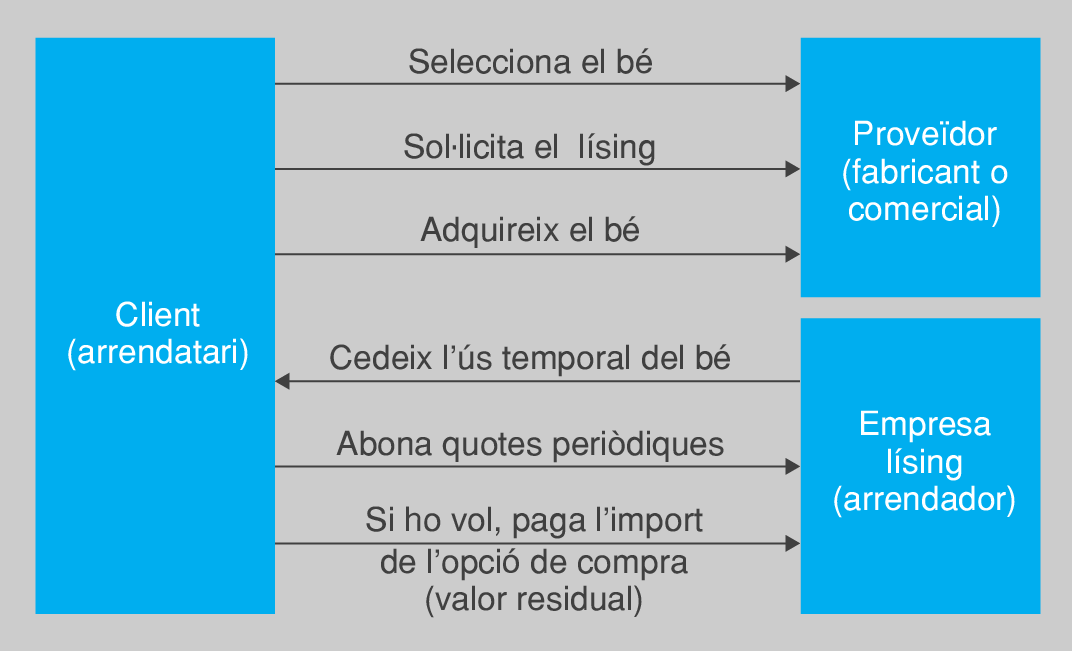 Pel que fa al lísing com a instrument de finançament de béns mobles o immobles que consisteix en la cessió, per part de l’empresa propietària (societat lísing), dels drets d’utilització d’aquest bé a l’empresa contractant del lísing, caldrà tenir en compte el període determinat de temps a canvi d’una quota d’arrendament, l’opció de compra i l’import a pagar.