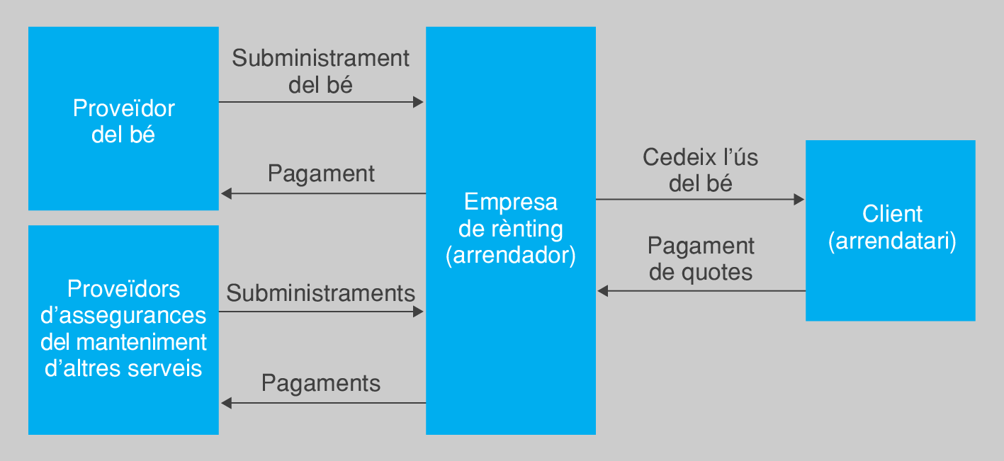 El rènting, a l’igual que el lísing, és una variant de lloguer de béns productius molt utilitzat per les empreses. El rènting és un arrendament pur. És un producte en el qual predomina el component de serveis sobre el financer (vegeu la figura).