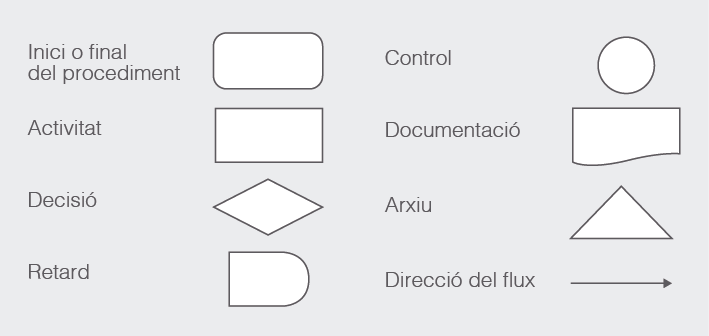 Per a la representació dels diagrames de flux existeixen una sèrie de símbols o dibuixos geomètrics normalitzats, els més habituals són els que podeu veure a la figura.