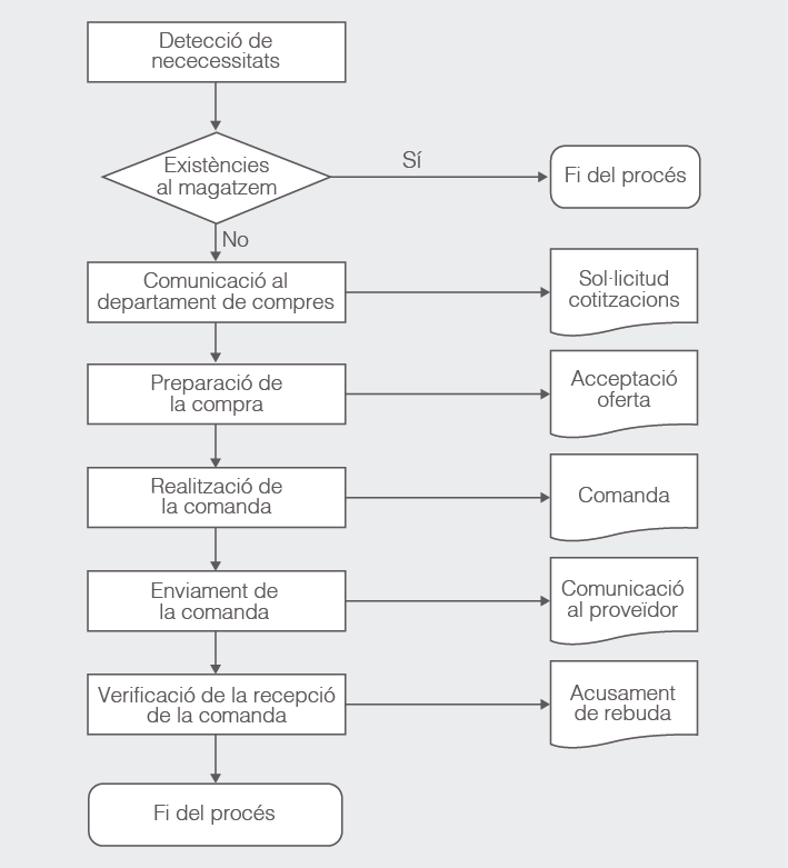 - Desenvolupament. Defineix el flux entre les diferents etapes, les verificacions i els documents corresponents. Normalment es descriu amb un diagrama o esquema. De forma esquemàtica, el procediment de compres es podria representar tal com mostra el diagrama de flux de la figura.
