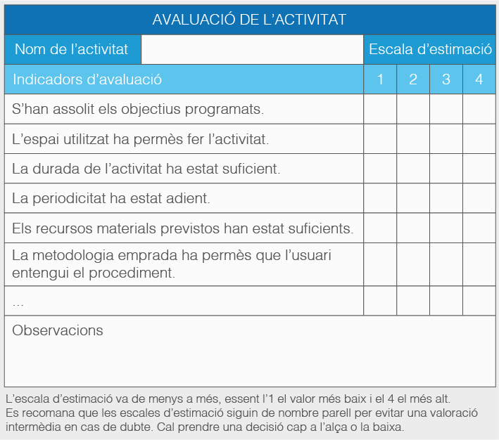 | Anàlisi de les necessitats | Observació, diari de camp, revisió documental, preguntes, escales de valoració | Durant la realització de les tasques professionals, el tècnic parla amb els usuaris i observa la seva situació amb una actitud de respecte i empatia. |