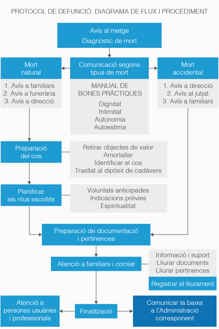 Generalment, a les residències geriàtriques és més habitual la baixa per defunció. Per tant, cada residència disposa d’un model de protocol que gestiona les passes que s’han de seguir en aquesta situació.