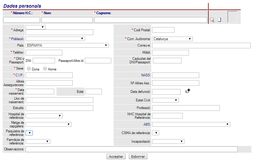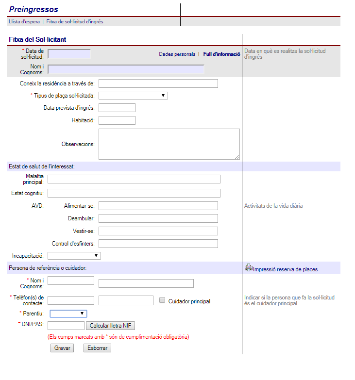 - Dades personals: nom, cognoms, DNI, data de naixement, familiars de contacte
