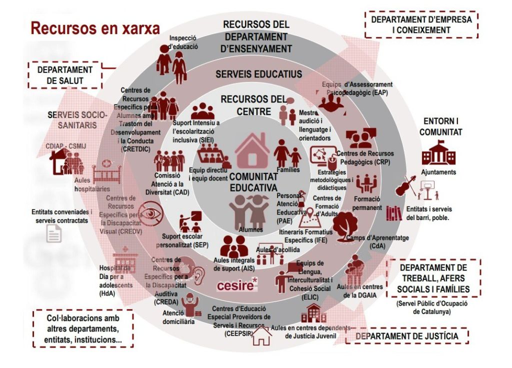 El Decret 150/2017, de 17 d’octubre, el qual s’ordena segons els principis rectors de la Llei d’educació 12/2009, del 10 de juliol, estableix uns criteris per a l’estructuració dels diferents suports a l’aula, dotant el professorat d’eines per al tractament de la diversitat durant la tasca docent.