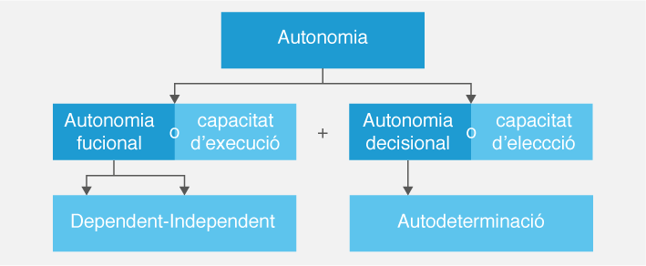 Es considera una persona autònoma aquella que té la capacitat de decidir i de prendre decisions personals, de manera lliure i no coaccionada, sobre com viure a partir de les seves preferències i tenint en compte les normes socials; és a dir, amb autodeterminació. I que, a més a més, pot realitzar les activitats bàsiques de la vida diària.