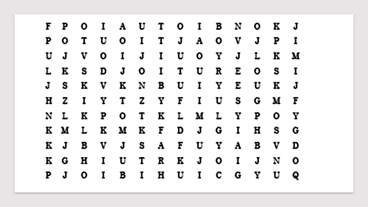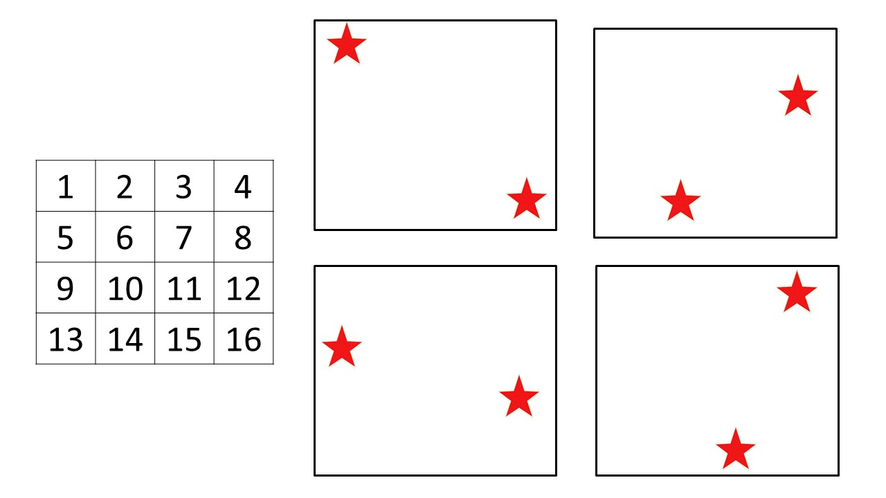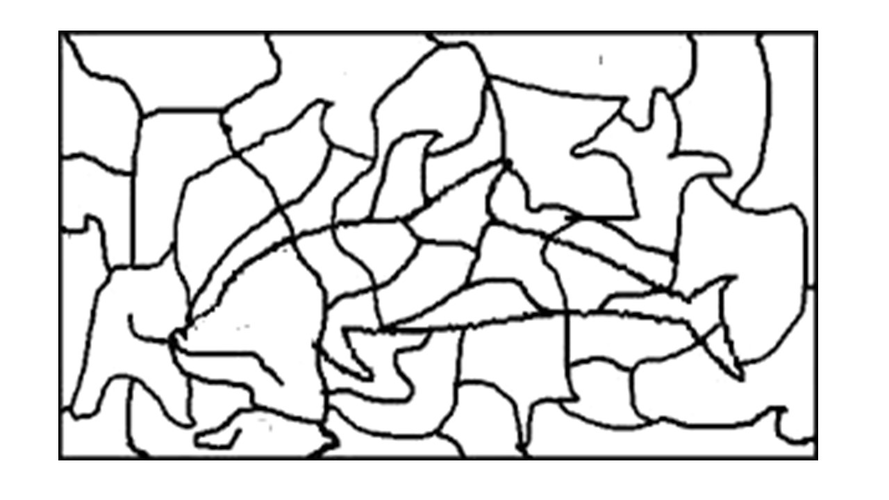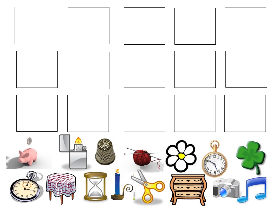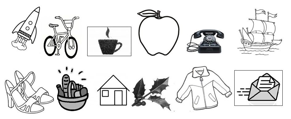 Material: làmina amb quatre fileres d’imatges. Cada filera conté la mateixa imatge repetida quatre vegades, però amb mides diferents. Dues imatges són de la mateixa mida, una tercera imatge és d’una mida superior i la quarta imatge és d’una mida inferior (vegeu la figura).