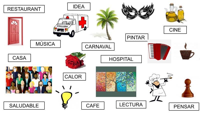 - Instruccions: a l’usuari se li presenten tres paraules escrites (en format de targetes) i se li demana que pensi i elabori una història on apareguin els tres conceptes (per exemple: casa, pastís, conill). Un cop ha elaborat la història (pot fer-ho mentalment o bé per escrit), l’explicarà de forma oral i es retiraran les tres paraules escrites. De nou, se sol·licita que expliqui la mateixa història, aquest cop sense poder visualitzar les tres paraules.