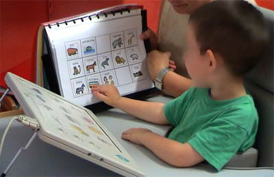 - Indicació directa: assenyalar directament un pictograma amb qualsevol part del cos o mitjançant una ajuda tècnica (ratolí adaptat o de cap, punter làser o alicorn). Vegeu la figura on es veu un usuari indicant directament amb el dit els símbols en un suport paper i us suggerim visionar també el vídeo penjat a la pàgina web d’UTAC, on s’exemplifica la indicació directa però amb ús del ratolí: