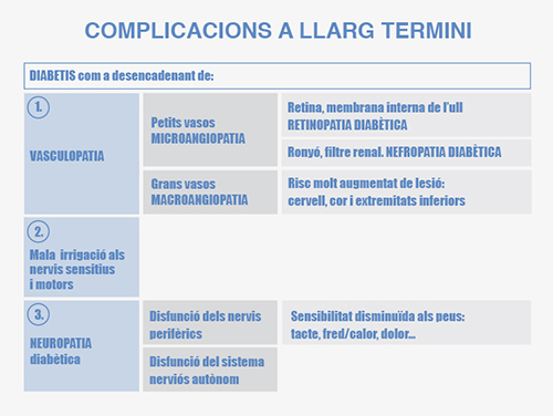 - Complicacions tardanes o cròniques: retinopatia, neuropatia, nefropatia i vasculopatia diabètiques.