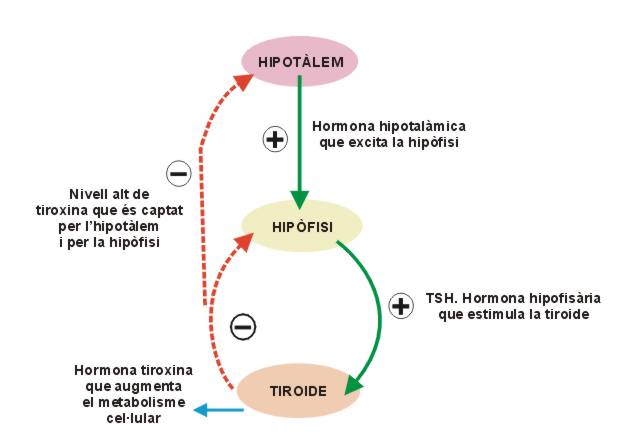 La producció d’hormones tiroïdals està controlada per una altra hormona anomenada TSH (hormona estimulant de la tiroide), que se sintetitza a la hipòfisi.