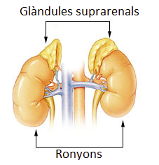 Són dues glàndules situades en la part superior de cada ronyó. La seva funció és la regulació de la pressió arterial, l’equilibri orgànic de líquids i minerals, el metabolisme de nutrients i el desenvolupament dels caràcters sexuals secundaris (vegeu la figura). S’hi distingeix una escorça (zona exterior) i una medul·la (zona interior).