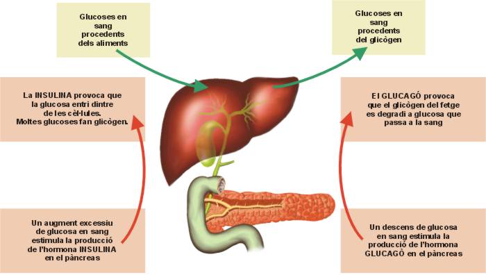 - Insulina: és sintetitzada per les cèl·lules beta, facilita que les cèl·lules absorbeixin la glucosa de la sang (aportant energia o emmagatzemant-la com a glicogen o lípids), és a dir, redueix la glucèmia o glucosa en sang. És hipoglucemiant.