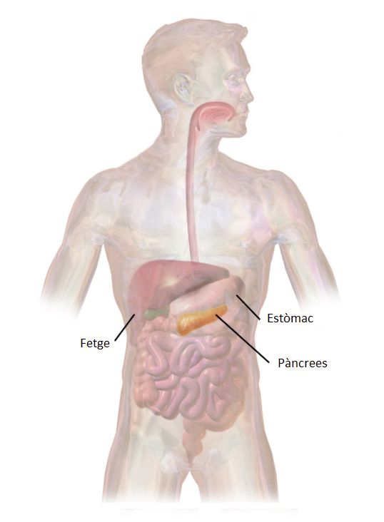 El pàncrees és un òrgan allargat situat en la part posterior de l’abdomen, darrere de l’estómac (vegeu la figura).