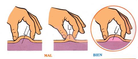 | 9. Agafar la xeringa o el pen d’insulina. Si s’utilitzen agulles de 4, 5 o 6 mm de llarg (són les adequades), introduir l’agulla sencera en angle de 90° (no obstant això, amb aquest llarg d’agulla no seria necessari fer el pessic). |