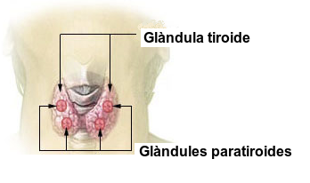 Per la seva banda, la glàndula paratiroide són quatre glàndules independents, normalment situades al teixit de la tiroide, en cadascuna de les “ales” de la papallona (vegeu la figura). Produeixen una hormona, la parathormona o hormona paratiroïdal (PTH), que estimula l’alliberament de calci dels ossos, amb la qual cosa augmenta la calcèmia (nivell de calci en sang).