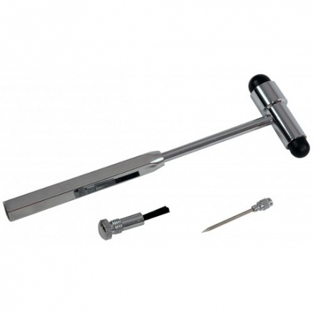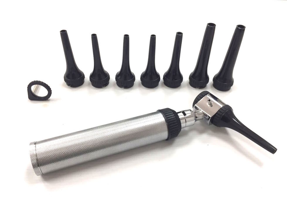 | Otoscopi o rinoscopi | Instrument per examinar la membrana timpànica i l’orella mitjana, o l’interior de les fosses nasals. L’otoscopi proporciona il·luminació i un espècul enfoca el feix de llum. S’ha de triar l’espècul més gran que s’ajusti a la mida del conducte auditiu de la persona usuària. En el cas de fer-ho servir com a rinoscopi (quan no es disposa d’espècul nasal), s’ha d’utilitzar l’espècul més curt i ample, i introduir-lo a l’orifici nasal de la persona. | ![]() | |