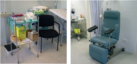 Pel que fa a l’extracció, cada punt ha d’estar dotat amb una butaca reclinable o cadira amb reposabraços i disposar d’una llitera a la mateixa àrea d’obtenció de mostres. S’ha de disposar també d’una taula auxiliar per al material d’extracció i un recipient adequat per a l’eliminació de residus sanitaris, amb especial atenció a l’eliminació d’objectes punxants. Hi ha d’haver un espai reservat i degudament identificat per a la preparació i conservació de les mostres i amb un rentamans per al personal.