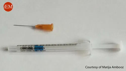 | 13. Realitzar una punció-aspiració amb la xeringa i agulla, mantenint una inclinació aproximada de 45° i aproximant-se al nivell de la paret de la lesió. En processos no supuratius preparar la xeringa amb mig ml de sèrum fisiològic per injectar i aspirar. |