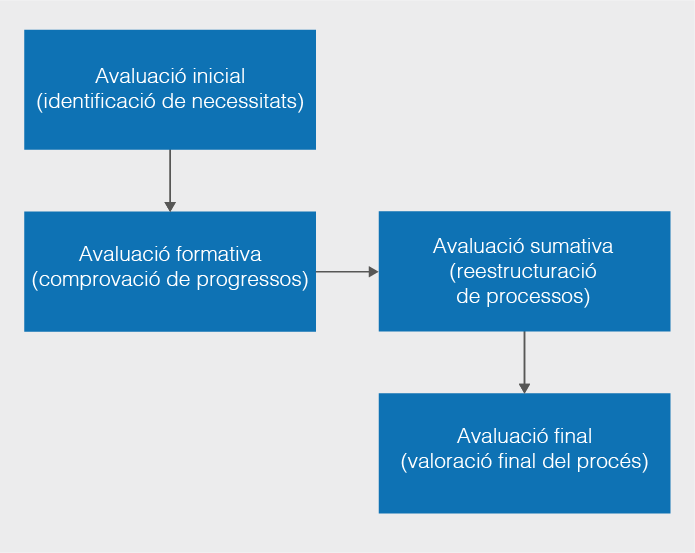 - Avaluació final: pretén fer la valoració final del procés d’ensenyament-aprenentatge de la persona, valoració sempre vinculada amb els objectius especificats prèviament.
