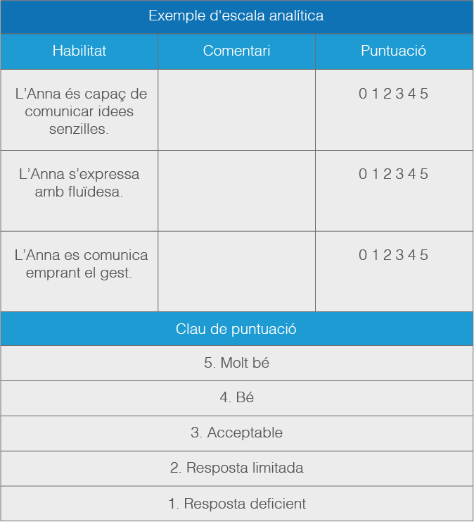 Les escales analítiques, de la mateixa manera que les pautes d’observació, permeten observar les actuacions de les persones en relació amb un criteri d’avaluació determinat. En aquest cas, a més, es pot establir una gradació per a cada un dels descriptors. Són més adequades quan es tracta d’observar habilitats que presenten una complexitat més gran per a la persona. Vegeu-ne un exemple a la figura.