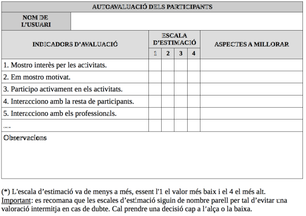 Amb l’avaluació dels participants es pretén valorar si els usuaris que participen en el programa han assolit els objectius operatius de les diferents activitats proposades. Per dur-la a terme, es dissenyen fitxes que serveixen de pauta i que incorporen els objectius operatius del programa i un conjunt de quatre o cinc indicadors d’observació per a cadascun, valorats sota una escala d’estimació qualitativa (“sí/no”; “molt/poc/suficient/gens”; “amb ajuda / sense ajuda”, etc.) o numèrica (en aquest cas, es recomana que s’utilitzi una escala de nombre parell en què cada número representi el grau en què es dona una conducta).