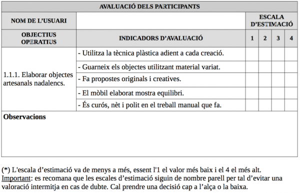 Prenent com a referència el taller de manualitats nadalenques, l’avaluació dels participants es pot concretar en els següents indicadors d’avaluació: