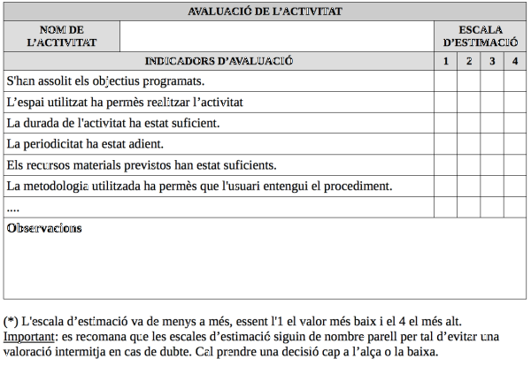 - Avaluació inicial: ajuda a valorar la situació de partida de cada usuari i establir els objectius que es volen aconseguir amb cadascun.
