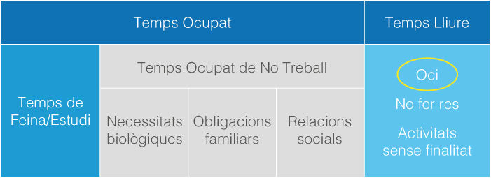 - Temps ocupat de no treball: temps dedicat a obligacions i necessitats. Inclou assumptes com: