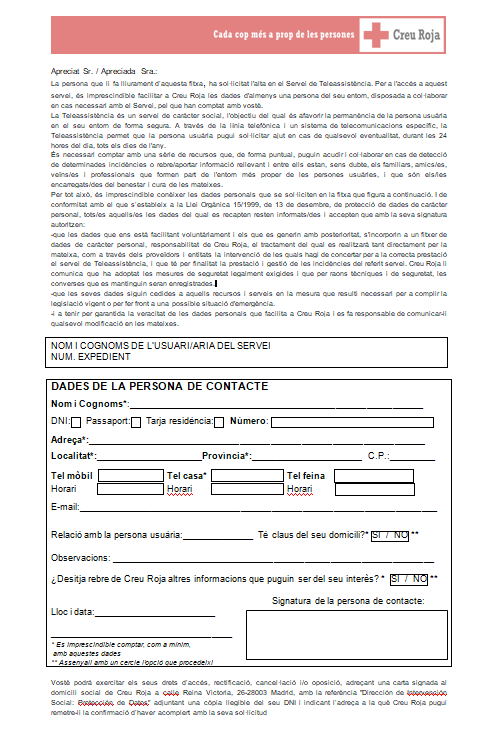 - Contactes personals: són totes aquelles persones, físiques i/o jurídiques, que la persona usuària facilita en el moment de la contractació del servei perquè se les pugui avisar i informar davant situacions que afectin la persona usuària del servei. Entre les persones físiques més habituals trobem els fills, veïns, amics… Entre les persones jurídiques trobaríem les mútues mèdiques, asseguradores, entitats de decés…