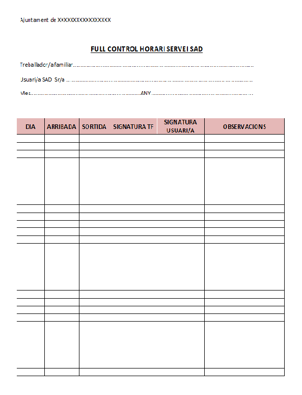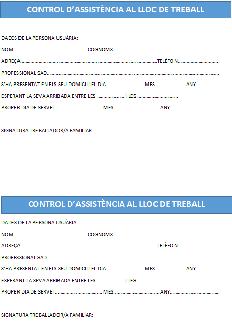 Cada dia de servei, per comptabilitzar el total d’hores prestades en un domicili, el treballador familiar facilitarà a la persona usuària del SAD un full que haurà de signar conforme el professional ha prestat el servei aquell dia.