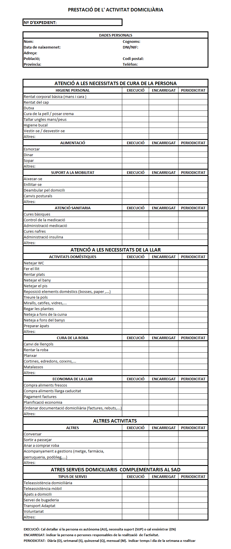 - Fulls per al registre de l’activitat diària, setmanal, mensual d’aquella unitat de convivència.