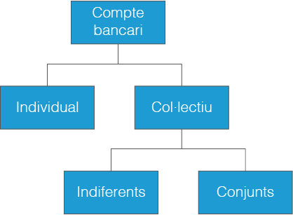 Un compte corrent pot ser de tipus individual, només amb un únic titular o bé col·lectiu, amb més d’un titular per al mateix compte. Alhora, els comptes col·lectius poden ser (vegeu la figura):