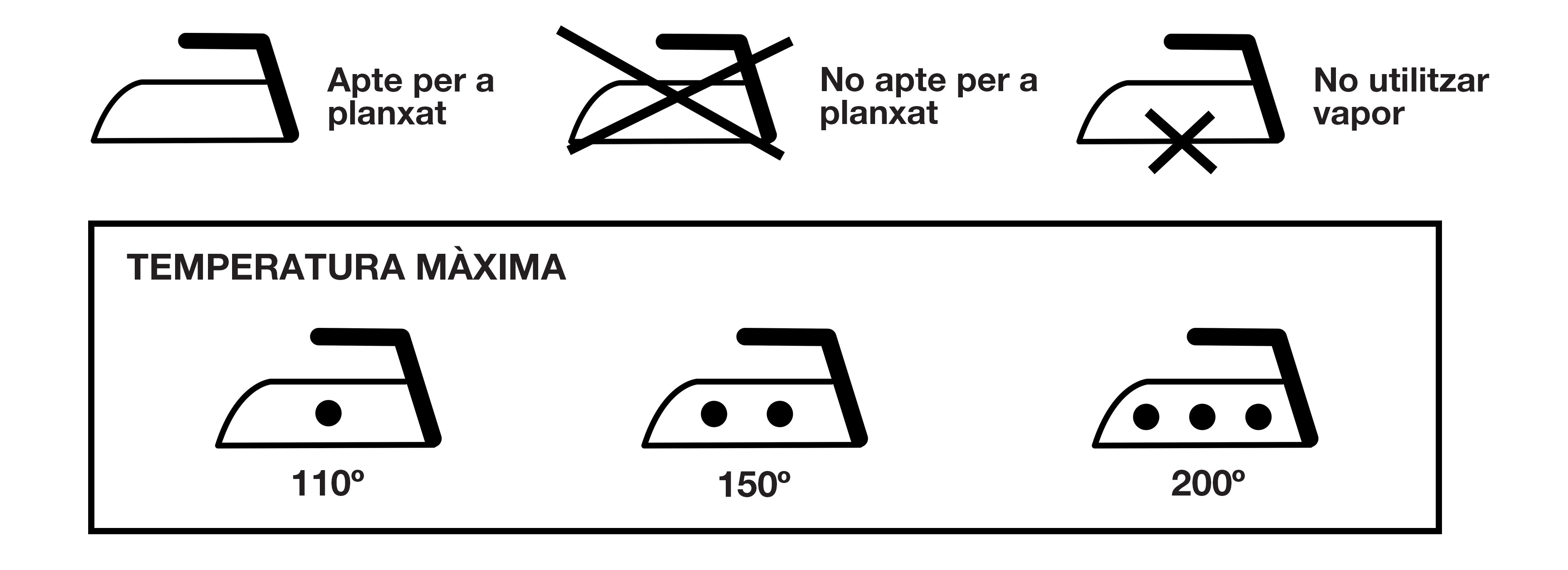 - La planxa: en funció dels punts dibuixats, indica la temperatura màxima a la qual es pot planxar la peça, coincidint amb la potència de la planxa. Si té una creu no es pot planxar.