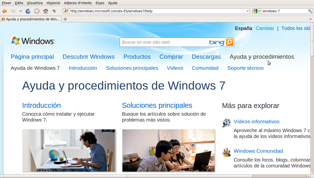 Si busquem a un cercador Windows 7, amb molta facilitat arribarem al web espanyol de Windows 7, que hauria de ser una pàgina semblant a la que podeu veure en la figura.