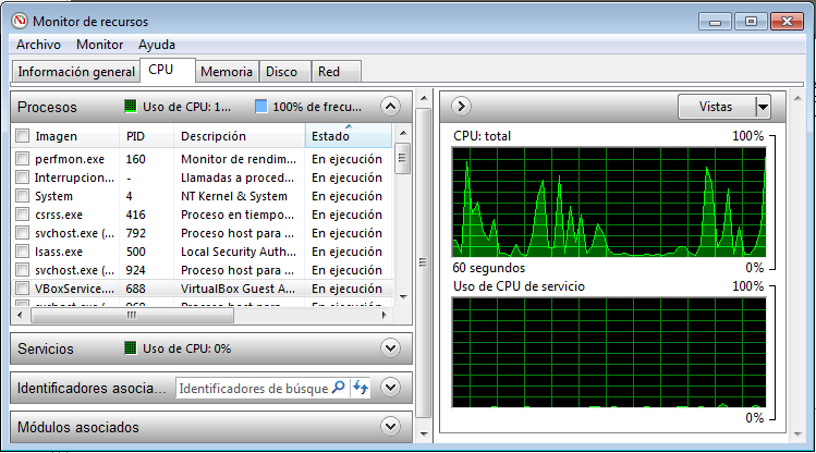 El monitor de recursos inclou cinc seccions: informació general, CPU, memòria, disc i xarxa, com es veu en la figura. La secció d’informació general mostra les dades bàsiques de l’ús dels recursos del sistema i cada una de les altres mostren informació específica incloent-hi, a la part dreta, gràfics on es mostra informació en temps real de la utilització del recurs.