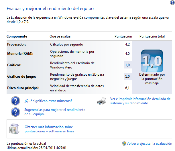 L’avaluació de l’experiència en Windows (figura) mesura la capacitat del sistema i expressa aquesta mesura en forma d’un número de puntuació total, com es pot veure en la figura. Cada component de maquinari rep també una puntuació individual que pot proporcionar informació del rendiment dels components més importants per donar una referència de l’estat d’avenç tecnològic en què es troben i ajudar a decidir quins d’aquests components tenen prioritat a l’hora d’actualitzar el sistema.