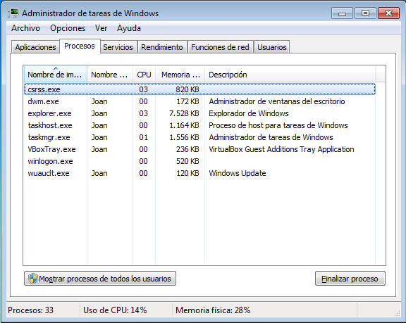 Per accedir a la consola d’administració de tasques cal fer servir la combinació de tecles CTRL+MAJÚSCULA+ESC, o bé mitjançant la finestra d’execució (TeclaWindows+R), i cridar l’aplicació taskmgr.exe* perquè aparegui la finestra següent.