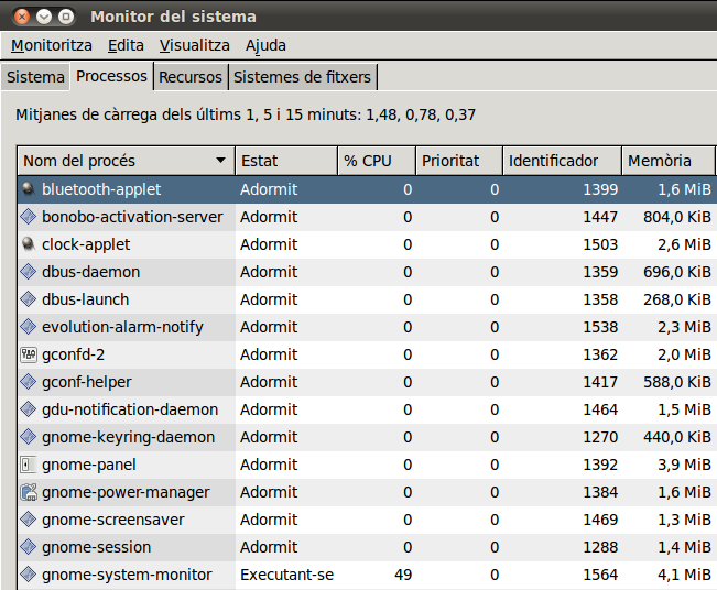 La mateixa eina gràfica del monitor del sistema, a més de visualitzar en temps real els recursos, per mitjà d’una pestanya permet controlar els processos que s’estan executant i el consum de recursos del sistema que fan (vegeu la figura).