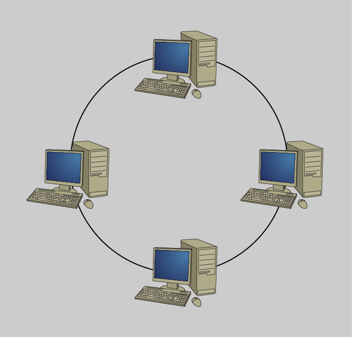- Xarxa en anell (figura) és una topologia de xarxa en què cada node està connectat a una connexió punt a punt amb els dos nodes adjacents, fins a l’últim, que és connectat al primer. Així es forma un camí unidireccional o bidireccional tancat, de tal manera que la informació ha de circular en un sentit (o en l’altre) passant pels nodes intermedis per tal d’arribar de l’origen a la destinació. La topologia lògica emprada habitualment en xarxes en anell es pot simular en una topologia física en bus o en estrella.
