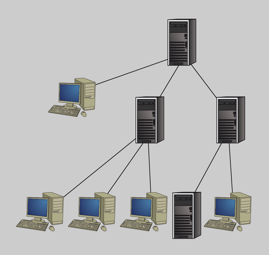 - Xarxa en arbre o jeràrquica (figura) és una topologia de xarxa en què un node pot tenir altres nodes subordinats que, al seu torn, poden tenir altres nodes subordinats, i ell mateix pot ser subordinat d’un altre de superior. La comunicació en aquests cassos s’efectua d’un node cap a un dels seus subordinats que o bé és la destinació o bé és un node superior de la destinació, i a l’inrevés, la comunicació es pot fer cap a un node superior que o bé és la destinació o bé és un superior de la destinació.