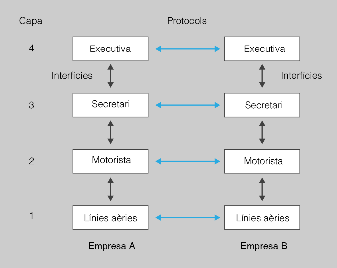 Observeu que en el procés anterior existeixen diferents nivells clarament diferenciats (capes): les executives, els secretaris, els missatgers (motoristes), i per últim l’empresa de línies aèries que s’ocupa del transport físic de la mercaderia. En tots aquests nivells (excepte probablement el més baix) hi ha dues entitats, la transmissora (A) i la receptora (B). Si tot succeeix segons el previst cada entitat només parlarà amb el seu corresponent de l’altra banda, i amb les seves entitats veïnes, és a dir, el cap de l’empresa A només parla amb el cap de l’empresa B i amb la seva secretària, aquesta parla amb el seu cap, amb el motorista i amb l’altre secretari per confirmar l’enviament, etc. En cap cas es contempla que la secretària d’A parli amb l’executiva de B. Si per exemple la secretària de l’empresa A és substituïda per malaltia els procediments seguiran funcionant, sempre i quan la secretària substituta desenvolupi la mateixa funció. Les variacions de caràcter intern només han de ser conegudes per les entitats consecutives; per exemple, el motorista de B podria ser canviat per una furgoneta de repartiment, i aquest fet només ha de ser conegut pel secretari de B i per la persona que lliura els paquets en l’aeroport. Això és el que s’anomena una interfície.