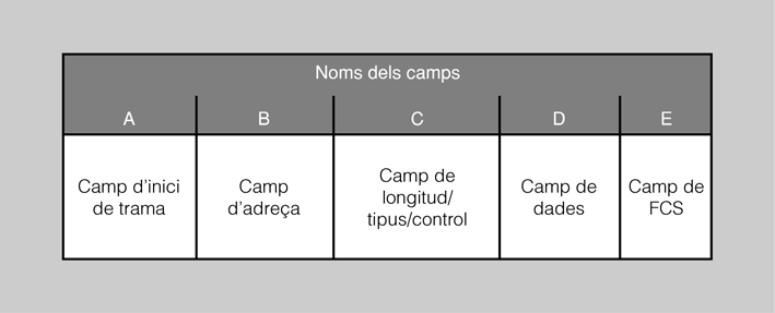 - Camps de longitud i tipologia (C). La majoria de les trames tenen camps especialitzats amb diferents finalitats en funció de la tecnologia utilitzada. Per exemple, aquest camp es pot utilitzar per indicar quin protocol de la capa 3 del model de referència OSI s’ha utilitzat o bé per especificar-hi la longitud exacta de la trama.