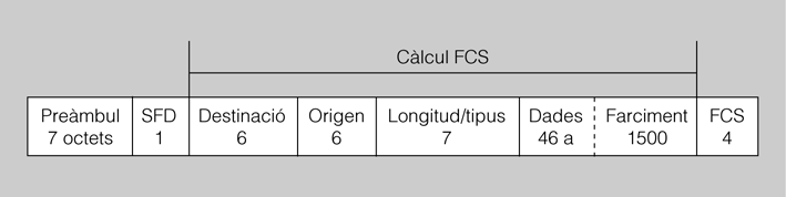 - Preàmbul: Amb la intenció de presentar tot tipus de compatibilitat, aquest camp conté un patró de set octets de longitud on s’alternen l’1 i el 0 per indicar l’inici de la trama.