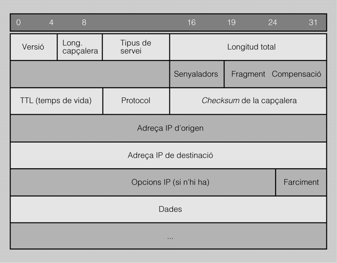 - Suma de comprovació de la capçalera (Checksum). Aquest camp verifica la integritat de la capçalera del paquet IP. La part de dades no es comprova i es deixa que ho facin les capes superiors. Si el procés de verificació falla, el paquet es descarta. Per calcular la suma de comprovació de la capçalera, l’emissor primer estableix a 0 aquest camp i després aplica l’algoritme de suma de comprovació. S’ha de tenir en compte que quan un dispositiu d’encaminament disminueix en 1 el TTL, el dispositiu d’encaminament té que recalcular el valor d’aquest camp. Va del bit 81 al 95.
