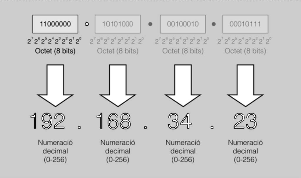 Tal com mostra la figura, l’adreça IP es compon de 4 octets, això és, agrupaments de 8 bits, expressats en numeració decimal (valors de 0 a 256) i separats per punts.