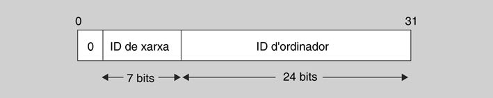- Adreça de classe A. El primer octet identifica la xarxa i el bit que pesa més sempre té el valor de 0. Els 7 bits següents identifiquen la xarxa, i la resta de bits (és a dir, 24) identifiquen les màquines connectades (figura). Aquesta combinació fa que la primera xarxa sigui la 0.0.0.0 i l’última, la 127.255.255.255. En aquest tipus d’adreces hi ha poques xarxes i molts ordinadors. Les adreces que marquen l’inici i final del rang en binari són: