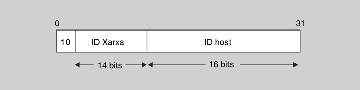 - Adreça de classe B. Els dos primers octets codifiquen les xarxes i els dos que pesen més sempre valen 10. Els 14 bits següents s’utilitzen per identificar les xarxes. En aquest tipus d’adreça s’utilitzen 16 bits per identificar les màquines connectades (figura). Aquesta combinació fa que la primera xarxa de classe B tingui el valor 128.0.0.0 i l’última adreça de classe B tingui el valor de 191.255.255.255. Tot i que la utilització d’adreces de classe B permet que hi hagi més xarxes que en una adreça de classe A, cada adreça de classe B accepta menys màquines connectades. Les adreces que marquen l’inici i final del rang en binari són: