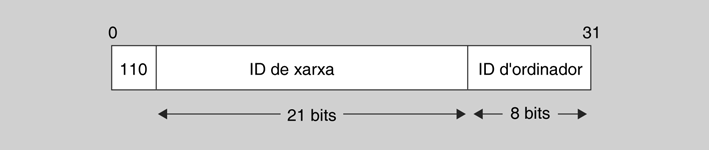 - Adreça de classe C. Els tres primers octets s’utilitzen per identificar les xarxes i l’últim octet es dedica a la identificació de l’ordinador. Els tres bits que pesen més de l’identificador de xarxa sempre tenen per valor el 110 (figura). Per tant, la primera xarxa de classe C que es podrà implementar tindrà l’adreça IP 192.0.0.0 i l’última serà la 223.255.255.255. Cal destacar que aquest valor indica que es poden implementar moltes xarxes en les adreces de classe C, però també que es poden connectar poques màquines a cada xarxa. Les adreces que marquen l’inici i final del rang en binari són:
