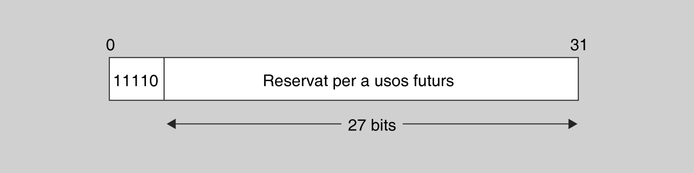 - Adreça de classe E. Són adreces IP que s’han reservat per a futures utilitzacions. Normalment l’IETF (Internet Engineering Task Force, Comitè d’Experts en Enginyeria d’Internet) les utilitza per investigar i, per tant, cap adreça de classe E s’utilitza a Internet. A l’hora d’identificar-les, cal destacar que els cinc primers bits que pesen més tenen un valor fix, això és, 11110 (figura). Tenint en compte que aquests bits no poden variar les adreces IP de classe E, van de l’adreça 240.0.0.0 a l’adreça 247.255.255.255, i els 27 bits restants estan reservats.
